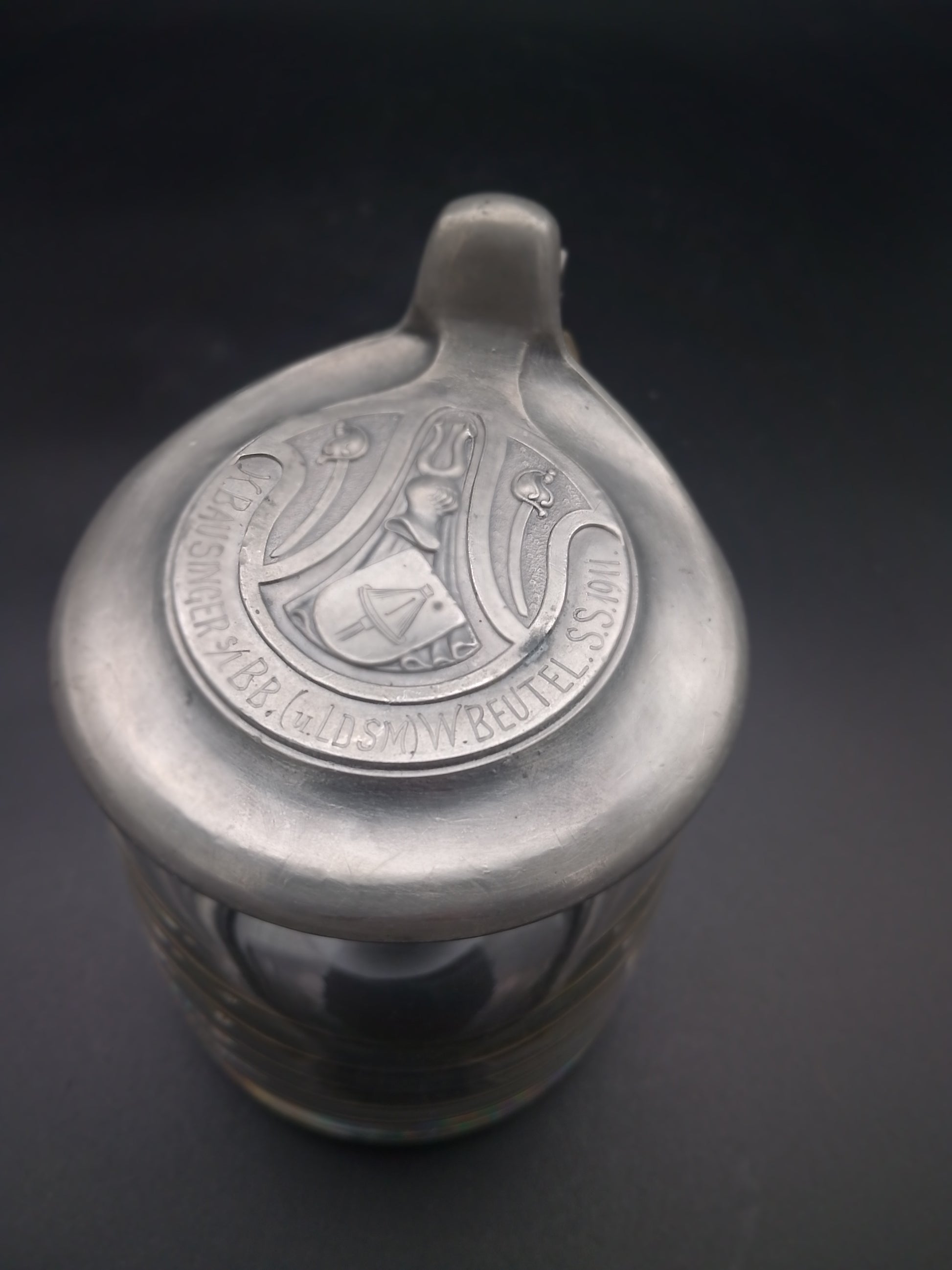 Dieser prachtvolle historische Bierkrug ist ein echtes Sammlerstück aus der deutschen Studentenverbindungskultur. Der Glas-Bierkrug mit originalem Zinndeckel stammt aus dem Jahr 1911 und trägt die authentische Aufschrift: BAUSINGER s/I BB. (u.LDSM) W. BEUTEL . S.S. 1911